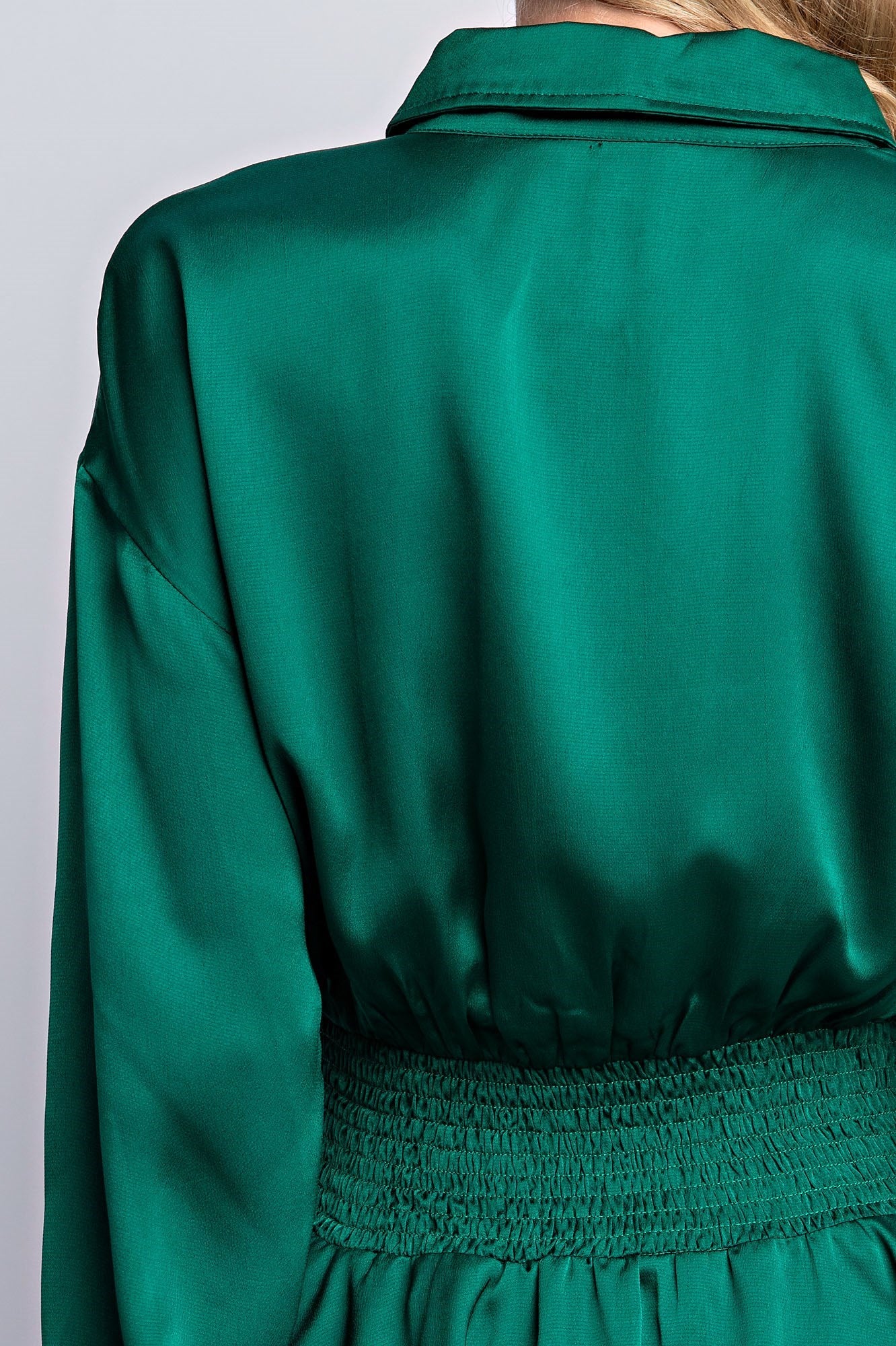 Material: Our Smocked Flowy Shirt Romper is crafted from a high-quality blend of rayon and spandex, ensuring softness, breathability, and a comfortable stretch.