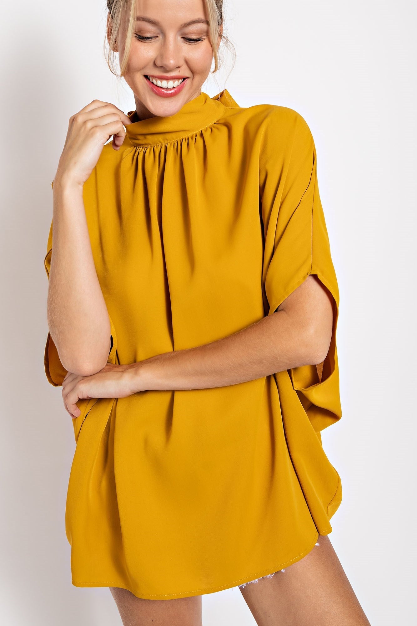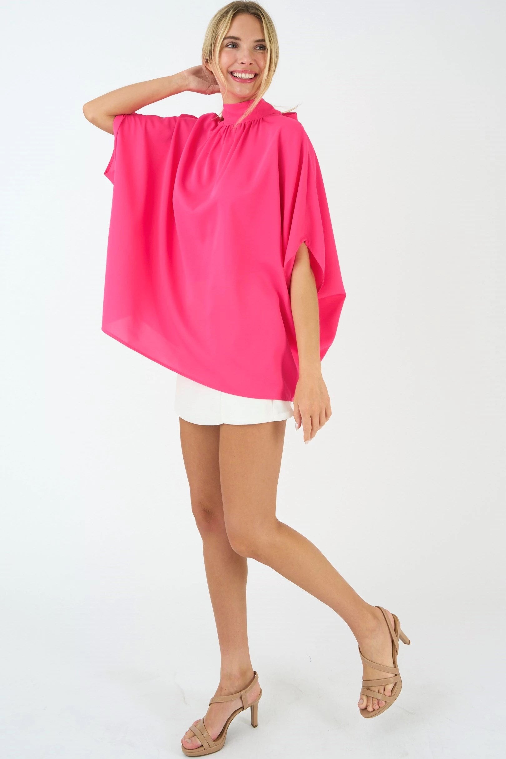 With our TIE BACK BATWING SLEEVE SOLID TOP, you'll effortlessly exude a sense of modern style and femininity. Whether you're heading to the office, enjoying a brunch with friends, or dressing up for a special occasion, this top is designed to keep you both fashionable and at ease.
